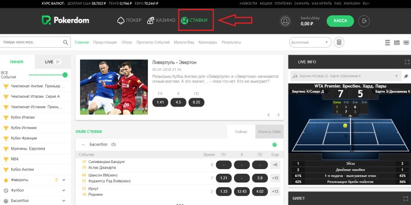 1. Во-первых, чтобы сделать ставки на спорт в ПокерДом нужно перейти на официальную страницу покер-руме, авторизоваться и нажать на раздел «Ставки», после чего вам будет доступен полный перечень спортивных ставок.